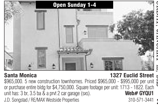 Santa Monica Open Sunday 1-4 1327 Euclid Street $965,000. 5new construction townhomes. Priced $965,000 -$995,000 per unit or purchase entirebldg for $4,750,000. Squarefootage per unit: 1713 -1822. Each unit has: 3br, 3.5 ba &aprvt 2car garage (sxs). Web# GYQU1 J.D. Songstad /RE/MAX Westside Properties 310-571-3441 11