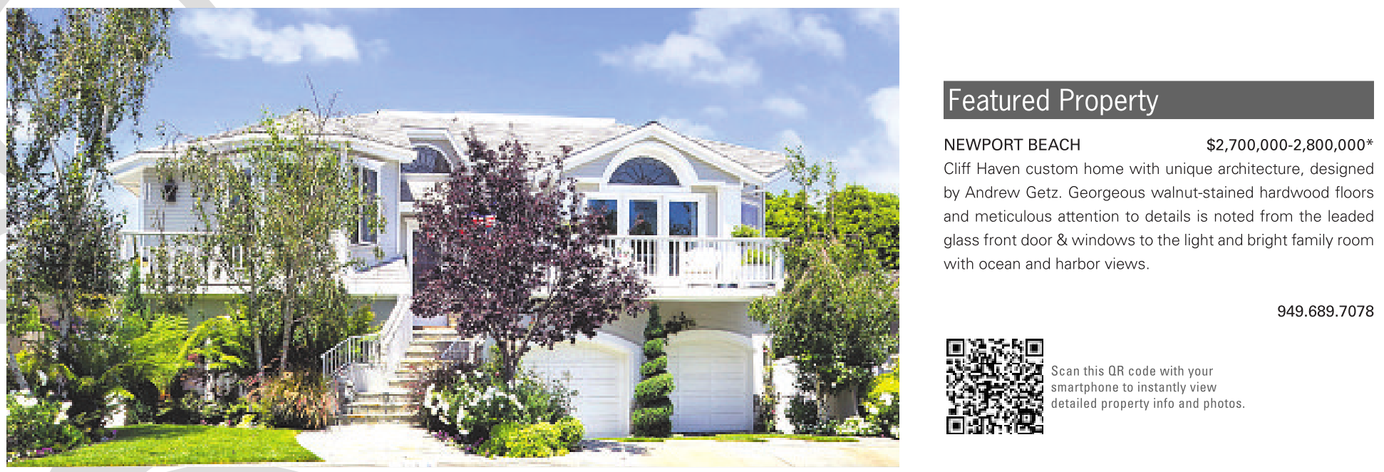 Featured Property NEWPORT BEACH $2,700,000-2,800,000* Cliff Haven custom home with unique architecture, designed by Andrew Getz. Georgeous walnut-stained hardwood floors and meticulous attention to details is noted from the leaded glass front door &windows to the light and bright family room with ocean and harbor views. 949.689.7078 Scan this QR code with your smartphone to instantly view detailed property info and photos.