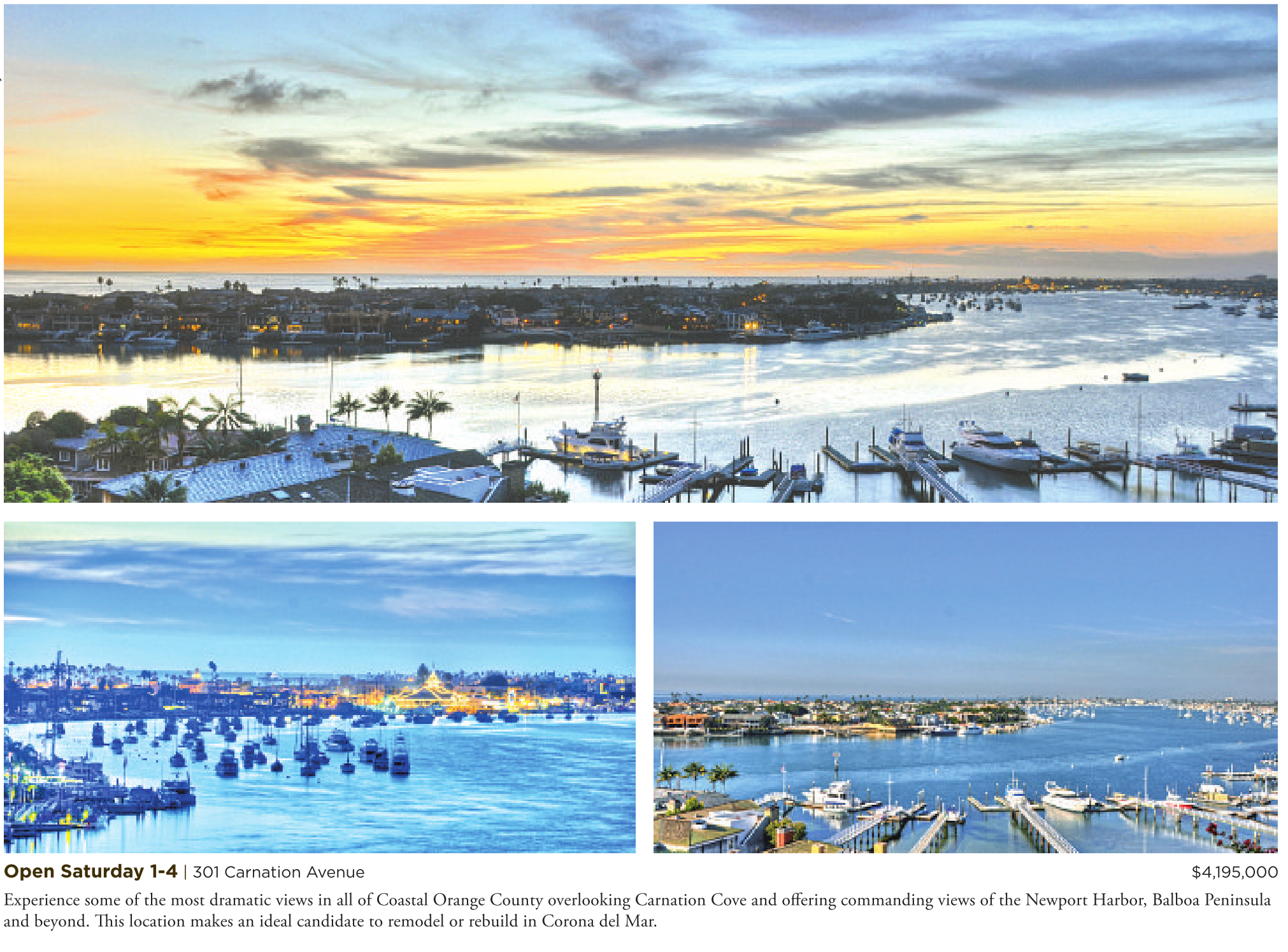 Open Saturday 1-4 | 301 Carnation Avenue $4,195,000 Experience some of the most dramatic views in all of Coastal Orange County overlooking Carnation Cove and offering commanding views of the Newport Harbor, Balboa Peninsula and beyond. This location makes an ideal candidate to remodel or rebuild in Corona del Mar.