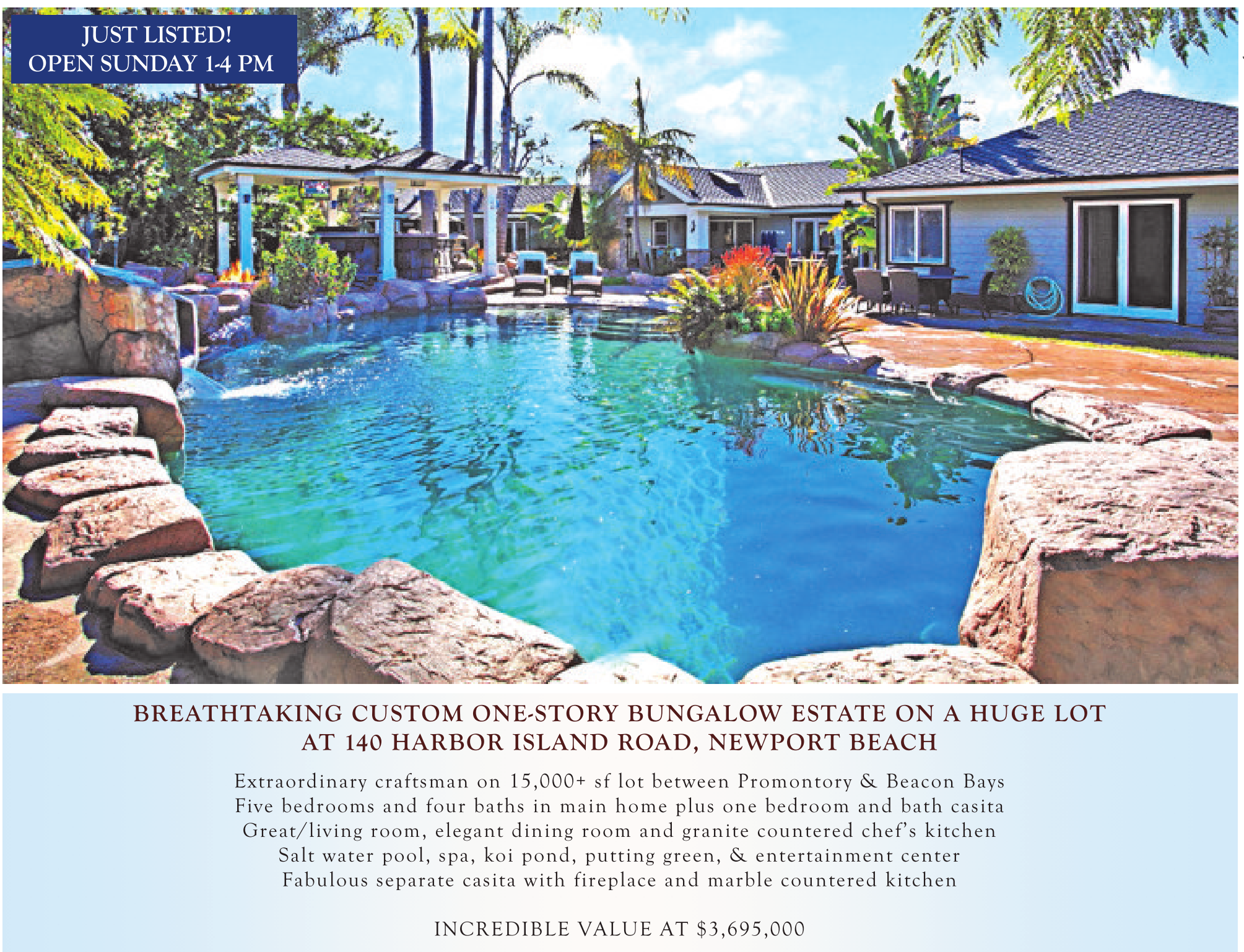 BREATHTAKING CUSTOM ONE-STORY BUNGALOW ESTATE ON A HUGE LOT AT 140 HARBOR ISLAND ROAD, NEWPORT BEACH