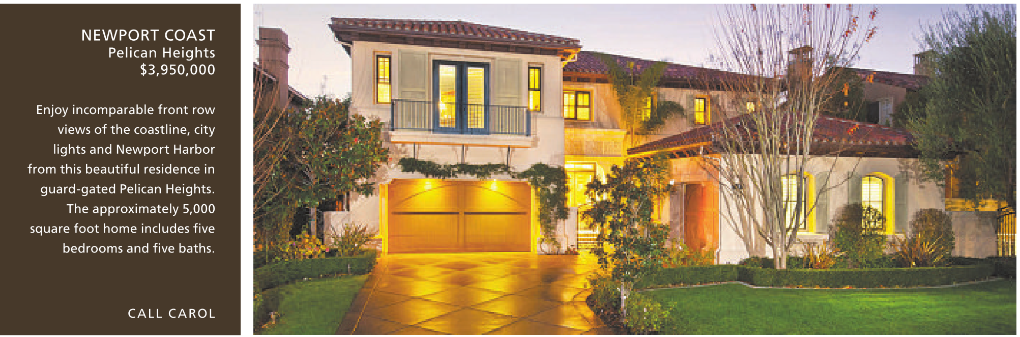 NEWPORT COAST Pelican Heights $3,950,000 Enjoy incomparable front row views of the coastline, city lights and Newport Harbor from this beautiful residence in guard-gated Pelican Heights. The approximately 5,000 square foot home includes five bedrooms and five baths. CALL CAROL