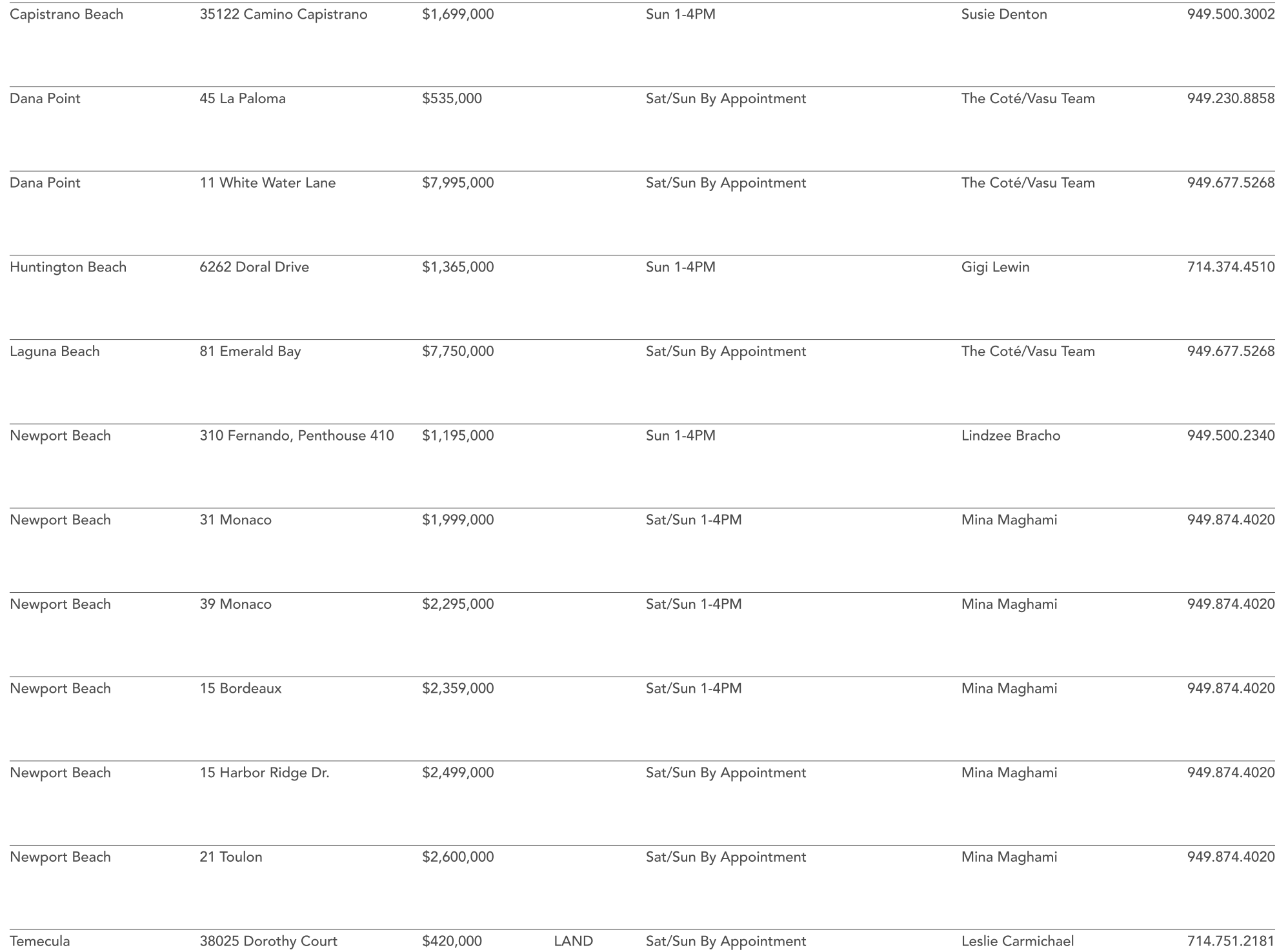 Newport Beach 15 Bordeaux $2,359,000 Sat/Sun 1-4PM Mina Maghami 949.874.4020