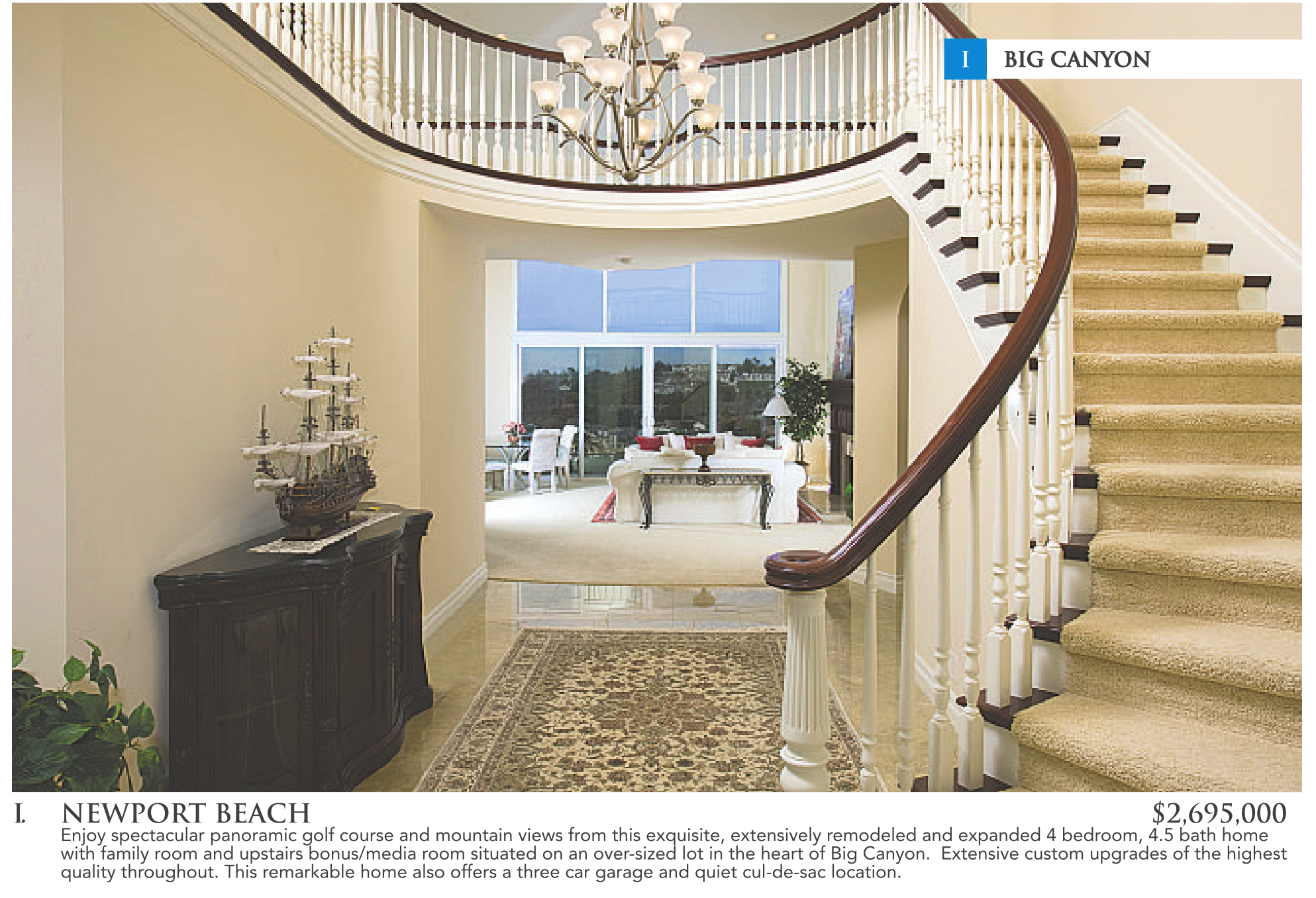 IBIG CANYON BIG CANYON I. NEWPORT BEACH $2,695,000 Enjoy spectacular panoramic golf course and mountain views from this exquisite, extensively remodeled and expanded 4 bedroom, 4.5 bath home with family room and upstairs bonus/media room situated on an over-sized lot in the heart of Big Canyon. Extensive custom upgrades of the highest quality throughout. This remarkable home also offers a three car garage and quiet cul-de-sac location.