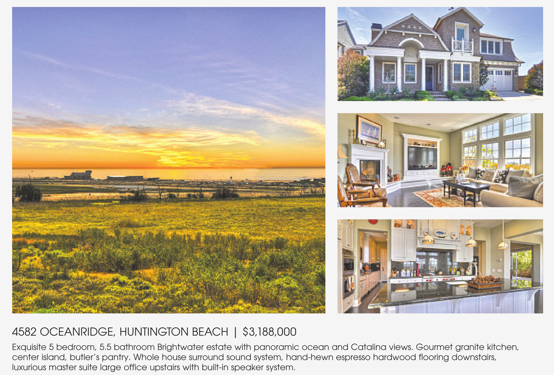 4582 OCEANRIDGE, HUNTINGTON BEACH | $3,188,000 Exquisite 5 bedroom, 5.5 bathroom Brightwater estate with panoramic ocean and Catalina views. Gourmet granite kitchen, center island, butler’s pantry. Whole house surround sound system, hand-hewn espresso hardwood flooring downstairs, luxurious master suite large office upstairs with built-in speaker system.