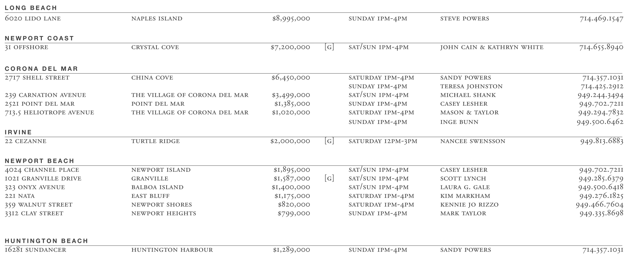 LONG BEACH 6020 lido lane naples island $8,995,000 sunday 1pm-4pm steve powers 714.469.1547 NEWPORT COAST 31 offshore crystal cove $7,200,000 [g] sat/sun 1pm-4pm john cain & kathryn white 714.655.8940 CORONA DEL MAR 2717 shell street china cove $6,450,000 saturday 1pm-4pm sandy powers 714.357.1031 sunday 1pm-4pm teresa johnston 714.425.2912 239 carnation avenue the village of corona del mar $3,499,000 sat/sun 1pm-4pm michael shank 949.244.3494 2521 point del mar point del mar $1,385,000 sunday 1pm-4pm casey lesher 949.702.7211 713.5 heliotrope avenue the village of corona del mar $1,020,000 saturday 1pm-4pm mason & taylor 949.294.7832 sunday 1pm-4pm inge bunn 949.500.6462 IRVINE 22 cezanne turtle ridge $2,000,000 [g] saturday 12pm-3pm nancee swensson 949.813.6883 NEWPORT BEACH 4024 channel place newport island $1,895,000 sat/sun 1pm-4pm casey lesher 949.702.7211 1021 granville drive granville $1,587,000 [g] sat/sun 1pm-4pm scott lynch 949.285.6379 323 onyx avenue balboa island $1,400,000 sat/sun 1pm-4pm laura g. gale 949.500.6418 221 nata east bluff $1,175,000 saturday 1pm-4pm kim markham 949.276.1825 359 walnut street newport shores $820,000 saturday 1pm-4pm kennie jo rizzo 949.466.7604 3312 clay street newport heights $799,000 sunday 1pm-4pm mark taylor 949.335.8698 HUNTINGTON BEACH 16281 sundancer huntington harbour $1,289,000 sunday 1pm-4pm sandy powers 714.357.1031