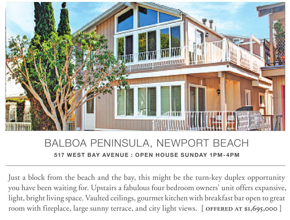 BALBOA PENINSULA, NEWPORT BEACH 517 WEST BAY AVENUE : OPEN HOUSE SUNDAY 1PM-4PM Just a block from the beach and the bay, this might be the turn-key duplex opportunity you have been waiting for. Upstairs a fabulous four bedroom owners’ unit offers expansive, light, bright living space. Vaultedceilings,gourmet kitchenwithbreakfast baropentogreat room with fireplace, large sunny terrace, and city light views. [ offered at $1,695,000 ] See also