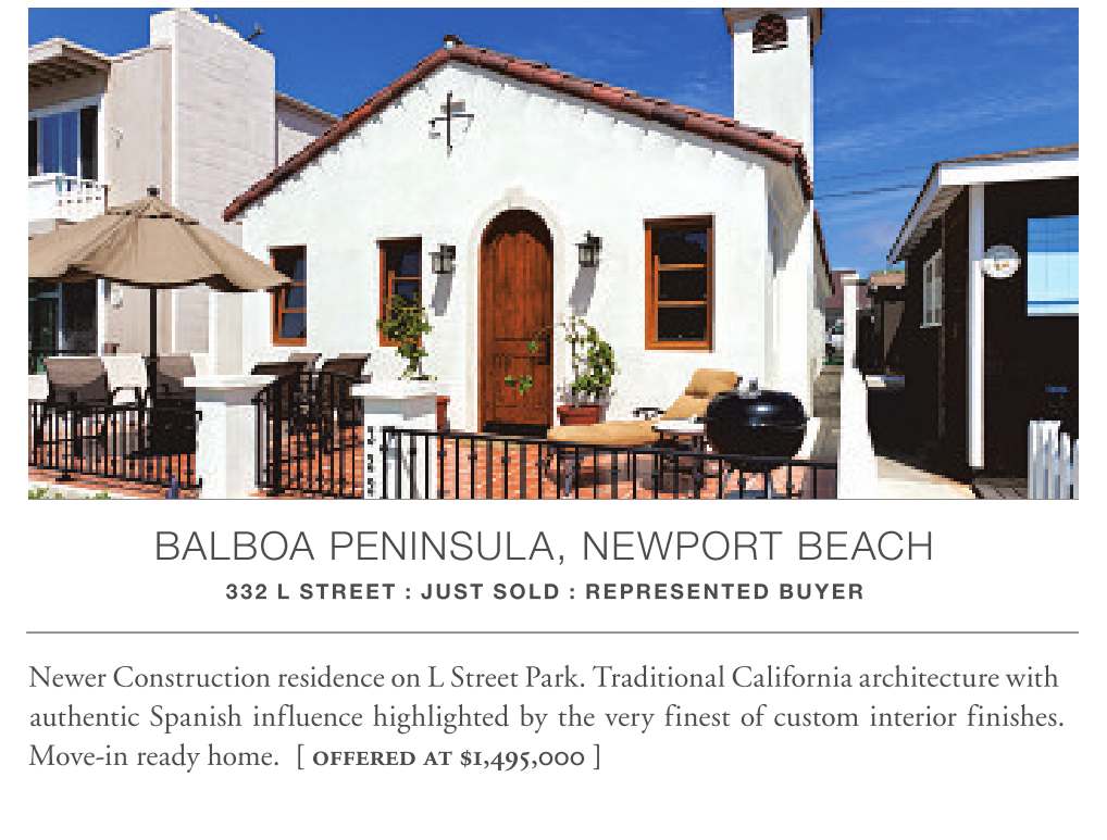 BALBOA PENINSULA, NEWPORT BEACH 332 L STREET : JUST SOLD : REPRESENTED BUYER Newer Construction residence on L Street Park. Traditional California architecture with authentic Spanish influence highlighted by the very finest of custom interior finishes. Move-in ready home. [ offered at $1,495,000 ] See also