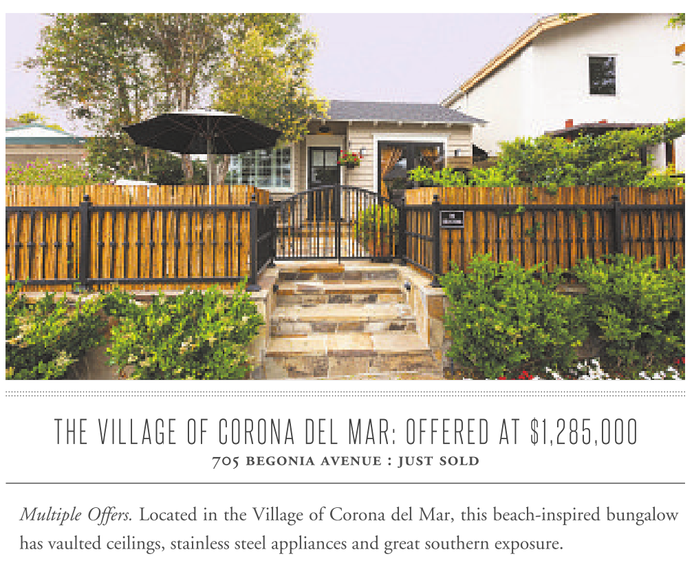Multiple Offers. Located in the Village of Corona del Mar, this beach-inspired bungalow has vaulted ceilings, stainless steel appliances and great southern exposure.