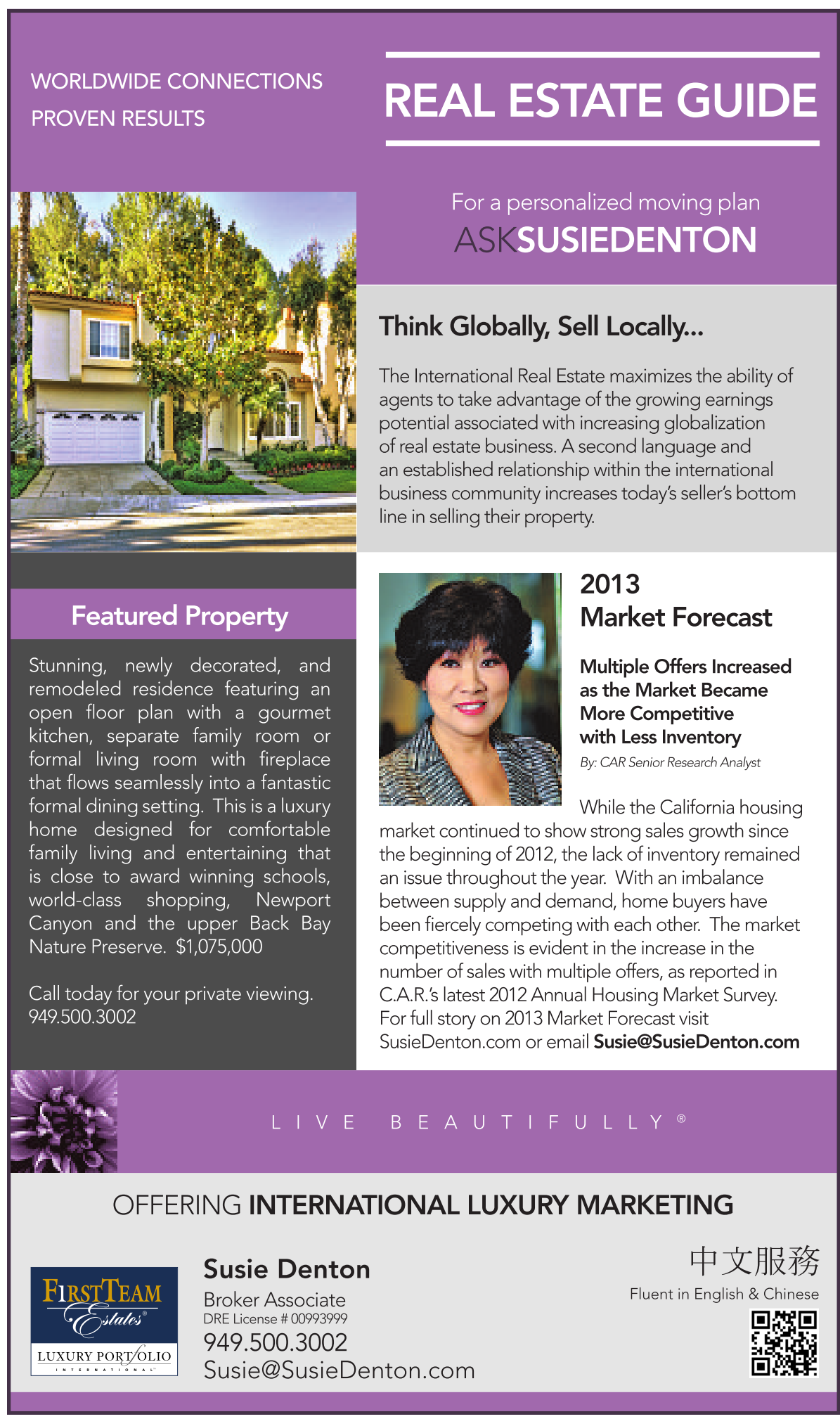 While the California housing market continued to show strong sales growth since the beginning of 2012, the lack of inventory remained an issue throughout the year. With an imbalance between supply and demand, home buyers have been fiercely competing with each other. The market competitiveness is evident in the increase in the number of sales with multiple offers, as reported in C.A.R.’slatest 2012 Annual Housing Market Survey. For full story on 2013 Market Forecast visit SusieDenton.com or email Susie@SusieDenton.com