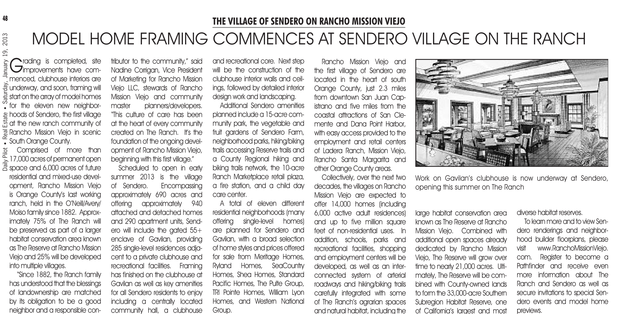 is completed, site improvements have commenced, clubhouse interiors are underway, and soon, framing will start on the array of model homes for the eleven new neighborhoods of Sendero, the first village at the new ranch community of Rancho Mission Viejo in scenic South Orange County.