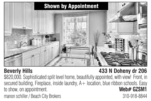 Shown by Appointment Beverly Hills 433 NDoheny dr 206 manon schiller /Beach City Brokers 310-918-8844 $820,000. Sophisticated split level home, beautifully appointed, with view! Front, in secured building. Fireplace, inside laundry,A+location, blue ribbon schools. Easy to show, on appointment. Web# GZSM1