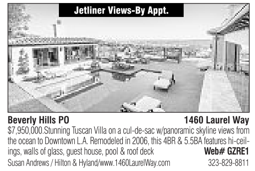 Jetliner Views-By Appt. Beverly Hills PO 1460 Laurel Way $7,950,000.Stunning Tuscan Villa on acul-de-sac w/panoramic skyline views from the ocean to Downtown L.A. Remodeled in 2006, this 4BR &5.5BA features hi-ceilings, walls of glass, guest house, pool &roof deck Web# GZRE1 Susan Andrews /Hilton &Hyland/www.1460LaurelWay.com 323-829-8811