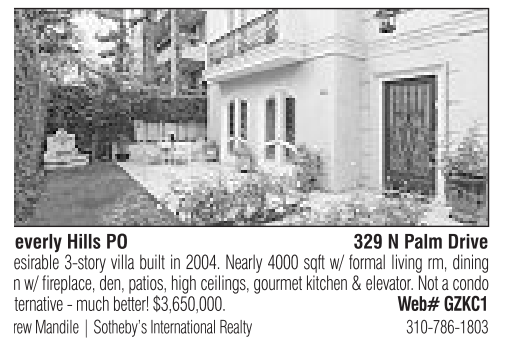 Beverly Hills PO 329 NPalm Drive esirable 3-story villa built in 2004. Nearly 4000 sqft w/ formal living rm, dining mw/fireplace, den, patios, high ceilings, gourmet kitchen &elevator.Not acondo ternative -much better! $3,650,000. Web# GZKC1 rewMandile |Sotheby’s International Realty 310-786-1803