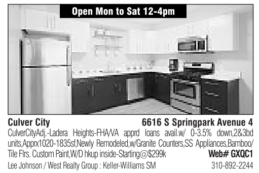 Open Mon to Sat 12-4pm Culver City 6616 SSpringpark Avenue 4 LeeJohnson /West Realty Group :Keller-Williams SM 310-892-2244 CulverCityAdj.-Ladera Heights-FHA/VA apprd loans avail.w/ 0-3.5% down,2&3bd units,Apprx1020-1835sf,Newly Remodeled,w/Granite Counters,SS Appliances,Bamboo/ Tile Flrs. Custom Paint,W/D hkup inside-Starting@$299k Web# GXQC1