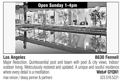 Open Sunday 1-4pm Los Angeles 8630 Fennell Major Reduction. Quintessential post and beam with pool & city views. Indoor/ outdoor living. Meticulously restored and updated. Aunique and soulful residence whereevery detail is ameditation. Web# GYQN1 max nelson /deasy penner &partners 323.578.5221 See also