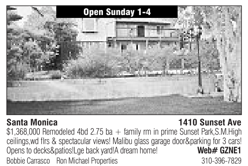 Open Sunday 1-4 Santa Monica 1410 Sunset Ave $1,368,000 Remodeled 4bd 2.75 ba +family rm in prime Sunset Park,S.M.High ceilings,wd flrs &spectacular views! Malibu glass garage door&parking for 3cars! Opens to decks&patios!Lge back yard!A dream home! Web# GZNE1 Bobbie Carrasco RonMichael Properties 310-396-7829 See also