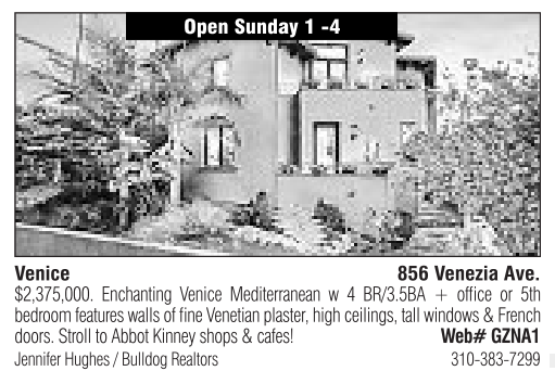 Open Sunday 1-4 Venice 856 Venezia Ave. $2,375,000. Enchanting Venice Mediterranean w 4 BR/3.5BA + office or 5th bedroom features walls of fine Venetian plaster,high ceilings, tall windows &French doors. Stroll to Abbot Kinney shops &cafes! Web# GZNA1 Jennifer Hughes /Bulldog Realtors 310-383-7299 See also