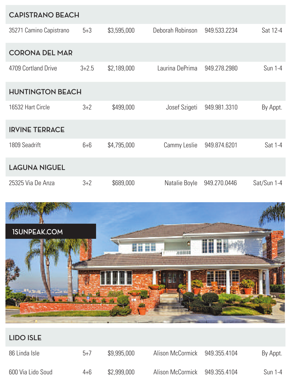 CAPISTrANO BeACH 35271 Camino Capistrano 5+3 $3,595,000 Deborah Robinson 949.533.2234 Sat 12-4 COrONA Del MAr 4709 Cortland Drive 3+2.5 $2,189,000 Laurina DePrima 949.278.2980 Sun 1-4 HuNTINGTONBeACH 16532 Hart Circle 3+2 $499,000 Josef Szigeti 949.981.3310 By Appt. IrvINe TerrACe 1809 Seadrift 6+6 $4,795,000 Cammy Leslie 949.874.6201 Sat 1-4 LaGuNA NIGuel 25325 ViaDeAnza 3+2 $689,000 Natalie Boyle 949.270.0446 Sat/Sun 1-4 1sunpeak.com lIDO ISle 86 Linda Isle 5+7 $9,995,000 Alison McCormick 949.355.4104 By Appt. 600 ViaLido Soud 4+6 $2,999,000 Alison McCormick 949.355.4104 Sun 1-4