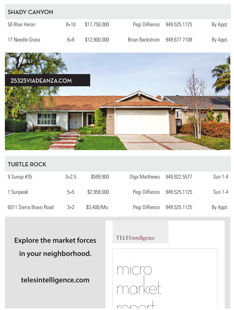 SHADYCANYON 50 Blue Heron 8+10 $17,750,000 Pegi DiRienzo 949.525.1125 By Appt. 17 Needle Grass 6+8 $12,900,000 Brian Backstrom 949.677.7108 By Appt. 25325viadeanza.com TurTle rOCk 9Sunup #35 3+2.5 $599,900 Olga Matthews 949.922.5577 Sun 1-4 1Sunpeak 5+5 $2,958,000 Pegi DiRienzo 949.525.1125 Sun 1-4 6011 Sierra Bravo Road 3+2 $3,400/Mo. Pegi DiRienzo 949.525.1125 By Appt. Explore the market forces in your neighborhood. telesintelligence.com TELESintelligence micro market report