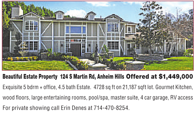 Beautiful Estate Property 124 SMartin Rd, Anheim Hills Offered at $1,449,000 Exquisite 5bdrm+office,4.5 bath Estate. 4728sqfton21,187sqftlot. Gourmet Kitchen, wood floors,large entertainingrooms, pool/spa,master suite,4car garage,RVaccess Forprivateshowing call Erin Denesat714-470-8254.
