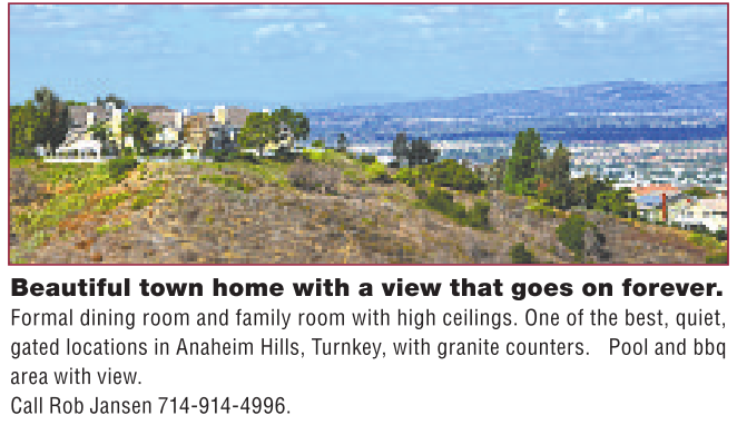 Beautiful town home with a view that goes on forever. Formal dining room and family room with high ceilings. One of the best, quiet, gated locations in Anaheim Hills, Turnkey, with granite counters. area with view. Call Rob Jansen 714-914-4996. Pool and bbq