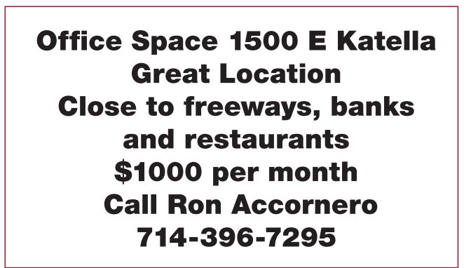 Office Space 1500 E Katella Great Location Close to freeways, banks and restaurants $1000 per month Call Ron Accornero 714-396-7295