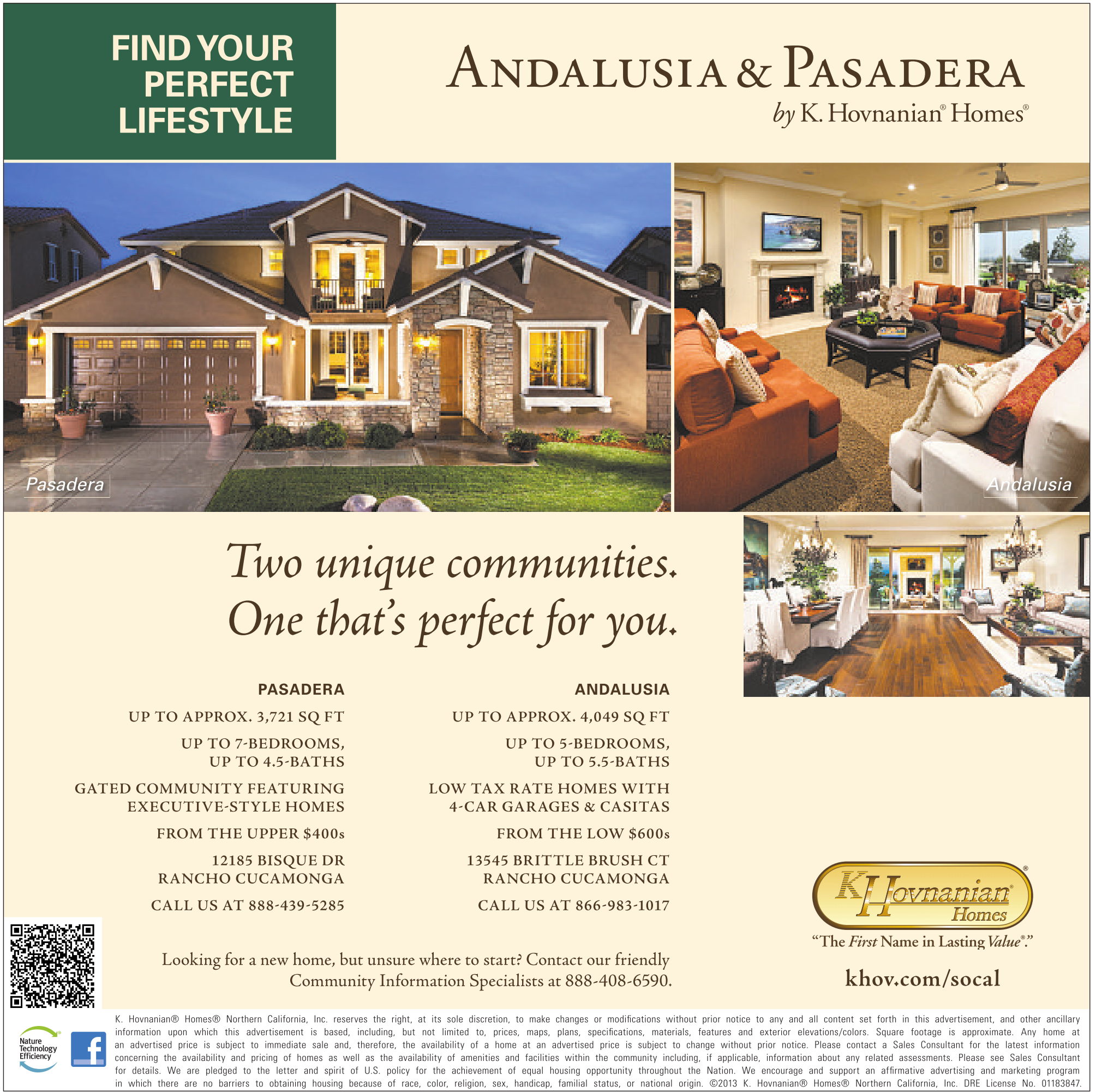 K. Hovnanian® Homes® Northern California, Inc. reserves the right, at its sole discretion, to make changes or modifications without prior notice to any and all content set forth in this advertisement, and other ancillary information upon which this advertisement is based, including, but not limited to, prices, maps, plans, specifications, materials, features and exterior elevations/colors. Square footage is approximate. Any home at an advertised price is subject to immediate sale and, therefore, the availability of a home at an advertised price is subject to change without prior notice. Please contact a Sales Consultant for the latest information concerning the availability and pricing of homes as well as the availability of amenities and facilities within the community including, if applicable, information about any related assessments. Please see Sales Consultant for details. We are pledged to the letter and spirit of U.S. policy for the achievement of equal housing opportunity throughout the Nation. We encourage and support an affirmative advertising and marketing program in which there are no barriers to obtaining housing because of race, color, religion, sex, handicap, familial status, or national origin. ©2013 K. Hovnanian® Homes® Northern California, Inc. DRE License No. 01183847.