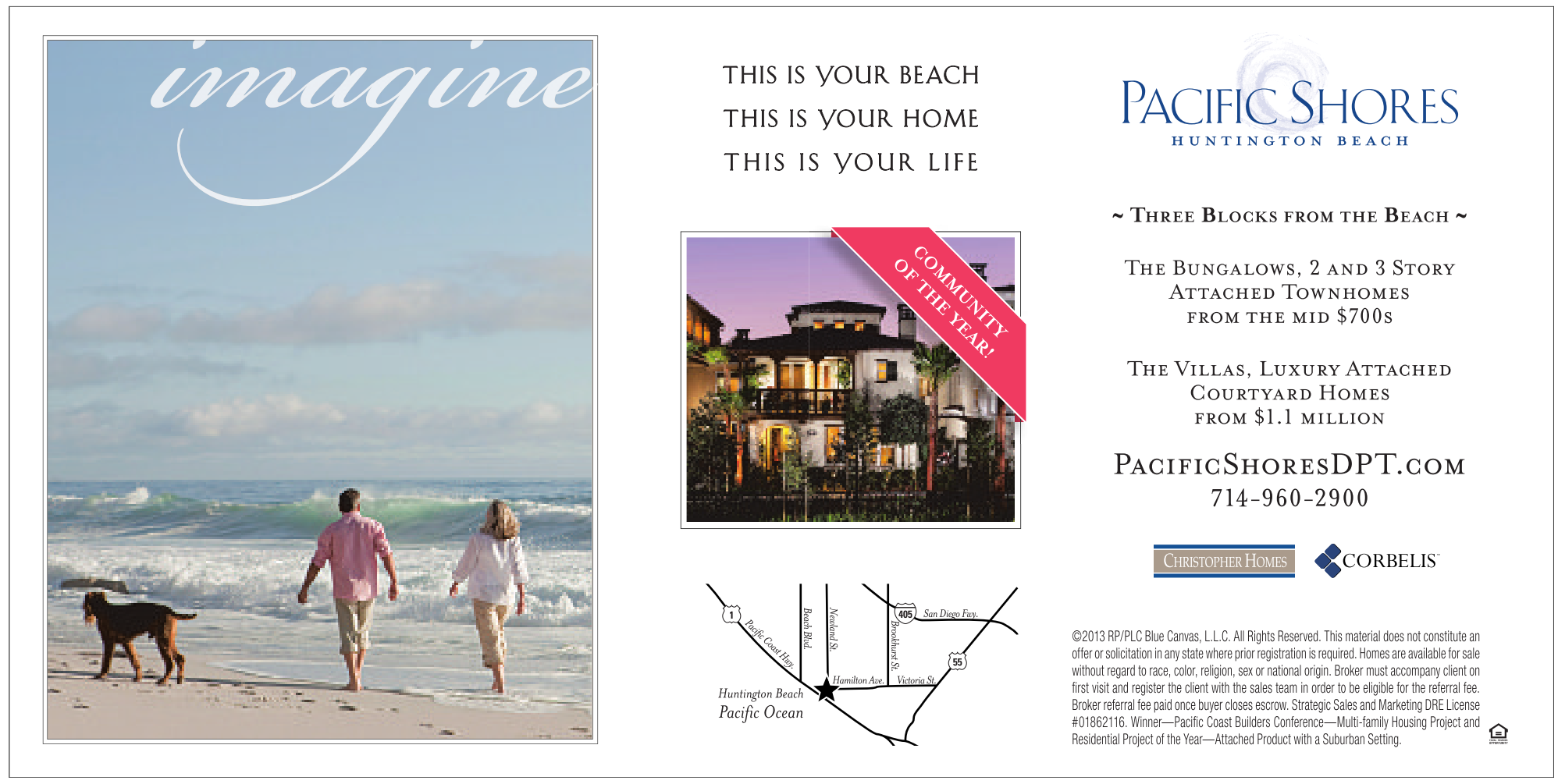 This is your Beach This is your home T h i s i s yo u r l i f e ~ THREE BLOCKS FROM THE BEACH ~ The Bungalows, 2 and 3 Story Attached Townhomes from the mid $700s The Villas, Luxury Attached Courtyard Homes from $1.1 million PacificShoresDPT.com 714-960-2900 1 405 Huntington Beach Pacific Ocean Hamilton Ave. Victoria St. San Diego Fwy. 55 ©2013RP/PLCBlueCanvas, L.L.C. AllRights Reserved.Thismaterial doesnot constitutean offerorsolicitationinany statewhereprior registrationisrequired. Homesare available forsale without regard to race,color,religion, sexornational origin. Broker must accompanyclienton first visit and register the client with the sales team inorder to be eligible for the referral fee. Broker referralfee paid once buyercloses escrow.StrategicSalesand MarketingDRE License #01862116. Winner—Pacific Coast Builders Conference—Multi-family Housing Project and Residential Project of theYear—AttachedProduct withaSuburban Setting.