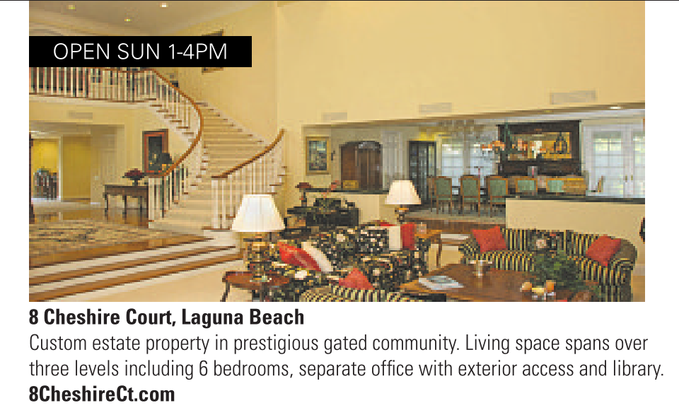 8 Cheshire Court, Laguna Beach Custom estate property in prestigious gated community. Living space spans over three levels including 6 bedrooms, separate office with exterior access and library. 8CheshireCt.com