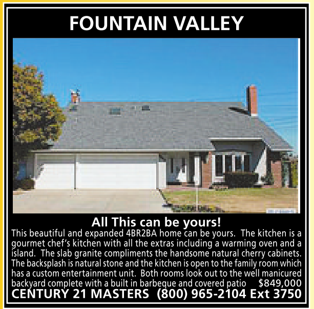 FOUNTAIN VALLEY All This can be yours! This beautiful and expanded 4BR2BA home can be yours. The kitchen is agourmet chef’s kitchen with all the extras including awarming oven and aisland. The slab granite compliments the handsome natural cherry cabinets. Thebacksplashisnatural stone andthe kitchen is open to thefamilyroomwhich has acustom entertainment unit. Both rooms look out to the well manicured backyard complete with abuilt in barbeque and covered patio $849,000 CENTURY 21 MASTERS (800) 965-2104 Ext 3750 See also