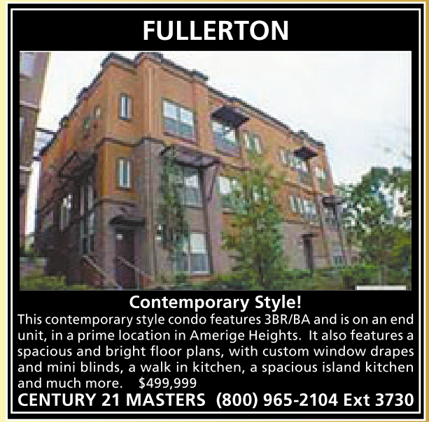 FULLERTON Contemporary Style! This contemporary stylecondofeatures 3BR/BA andisonanend unit,inaprimelocation in AmerigeHeights. It also features aspacious and bright floor plans, with custom window drapes and mini blinds, a walk in kitchen, a spacious island kitchen and much more. $499,999 CENTURY 21 MASTERS (800) 965-2104 Ext 3730 See also