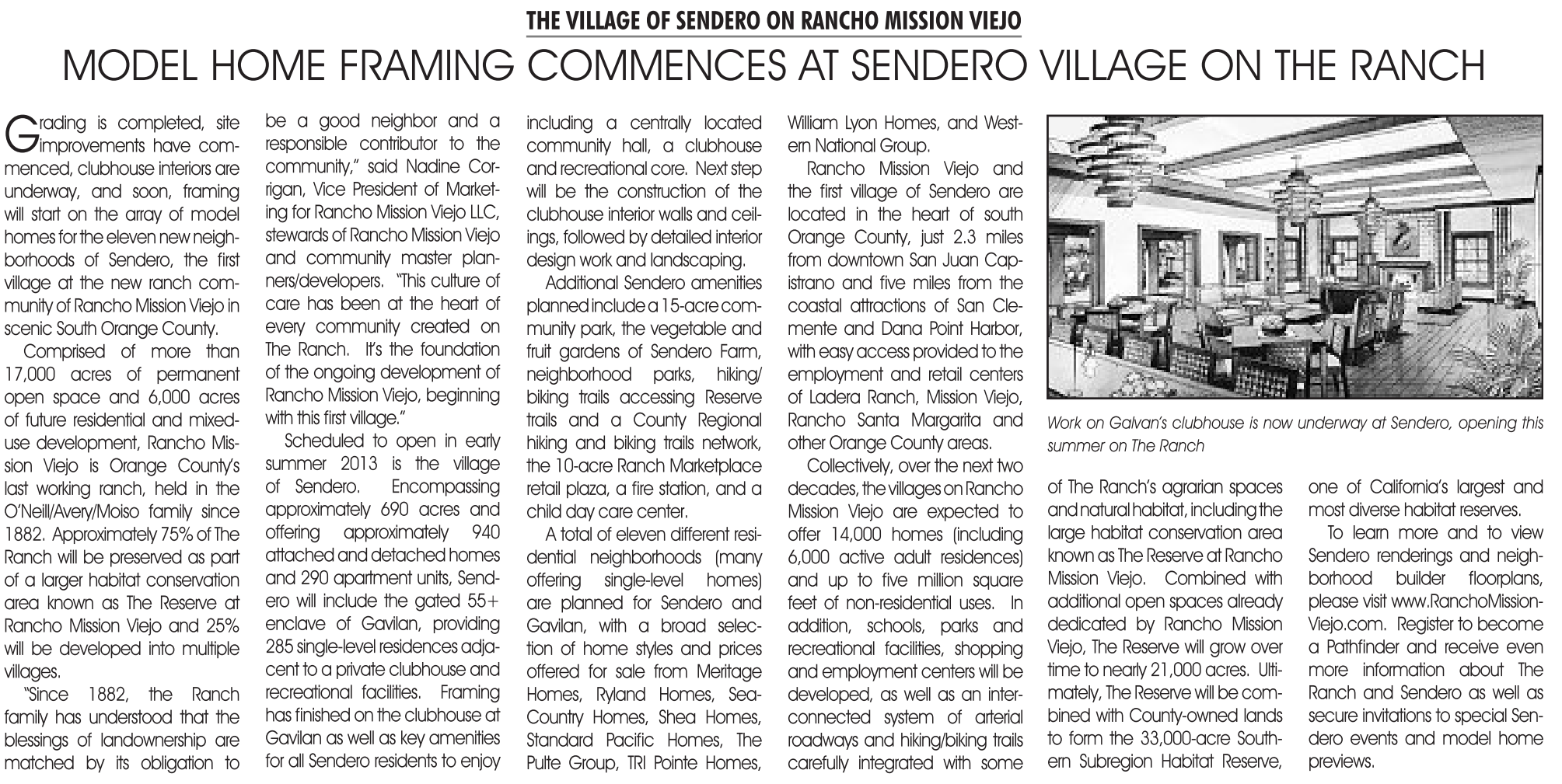 is completed, site improvements have commenced,clubhouse interiors are underway, and soon, framing will start on the array of model homes for the eleven new neighborhoods of Sendero, the first village at the new ranch community of Rancho Mission Viejo in scenic South Orange County.