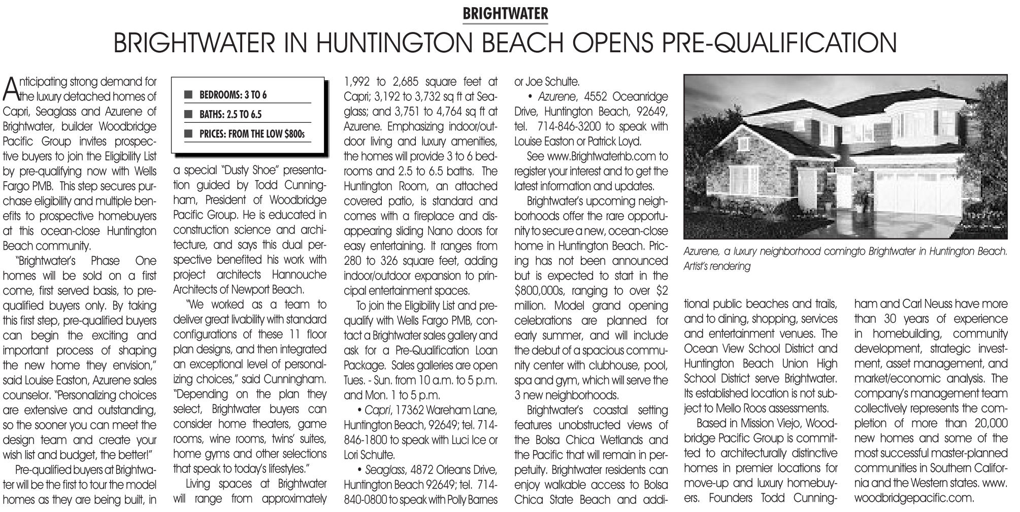 strong demand for the luxury detached homes of Capri, Seaglass and Azurene of Brightwater, builder Woodbridge Pacific Group invites prospective buyers to join the Eligibility List by pre-qualifying now with Wells Fargo PMB. This step secures purchase eligibility and multiple benefits to prospective homebuyers at this ocean-close Huntington Beach community.