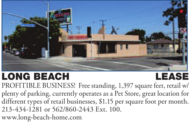 LONG BEACH LEASE PROFITIBLE BUSINESS! Freestanding, 1,397squarefeet,retailw/ plentyofparking,currently operatesasaPet Store, greatlocationfor differenttypes of retail businesses,$1.15 persquarefootper month. 213-434-1281 or 562/860-2443 Ext. 100. www.long-beach-home.com