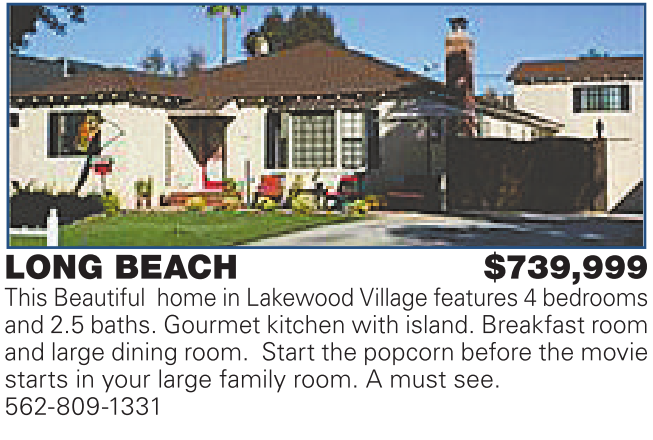 LONG BEACH $739,999 This Beautiful homeinLakewood Villagefeatures4bedrooms and 2.5 baths. Gourmet kitchen with island. Breakfast room and large dining room. Start the popcorn before the movie starts in your large family room. A must see. 562-809-1331