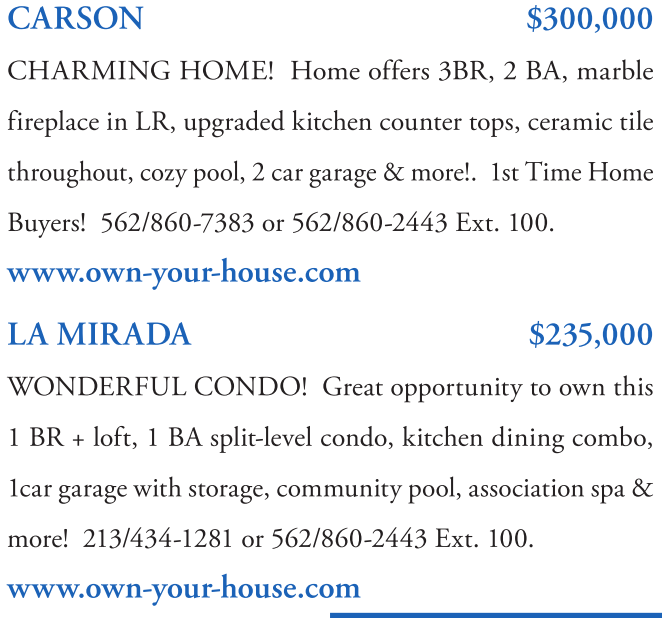 CARSON $300,000 CHARMING HOME! Home offers 3BR, 2 BA, marble fireplace in LR, upgraded kitchen counter tops, ceramic tile throughout, cozy pool, 2 car garage & more!. 1st Time Home Buyers! 562/860-7383 or 562/860-2443 Ext. 100. www.own-your-house.com LA MIRADA $235,000 WONDERFUL CONDO! Great opportunity to own this 1 BR + loft, 1 BA split-level condo, kitchen dining combo, 1car garage with storage, community pool, association spa &more! 213/434-1281 or 562/860-2443 Ext. 100. www.own-your-house.com “YOUR
