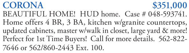 CORONA $351,000 BEAUTIFUL HOME! HUD home. Case # 048-593741. Home offers 4 BR, 3 BA, kitchen w/granite countertops, updated cabinets, master w/walk in closet, large yard & more! Perfect for 1st Time Buyers! Call for more details. 562-822- 7646 or 562/860-2443 Ext. 100.