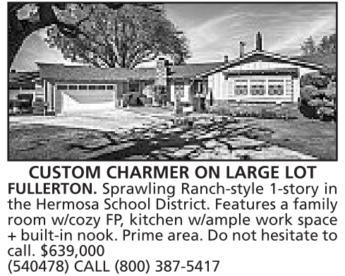 CUSTOM CHARMER ON LARGE LOT FULLERTON. Sprawling Ranch-style 1-story in the Hermosa School District. Features a family room w/cozy FP, kitchen w/ample work space +built-in nook. Prime area. Do not hesitate to call. $639,000 (540478) CALL (800) 387-5417
