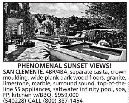PHENOMENAL SUNSET VIEWS! SAN CLEMENTE. 4BR/4BA, separate casita, crown moulding, wide-plankdark wood floors, granite, limestone, marble, surround sound, top-of-theline SS appliances, saltwater infinity pool, spa, FP, kitchen w/BBQ. $959,000 (540228) CALL (800) 387-1454