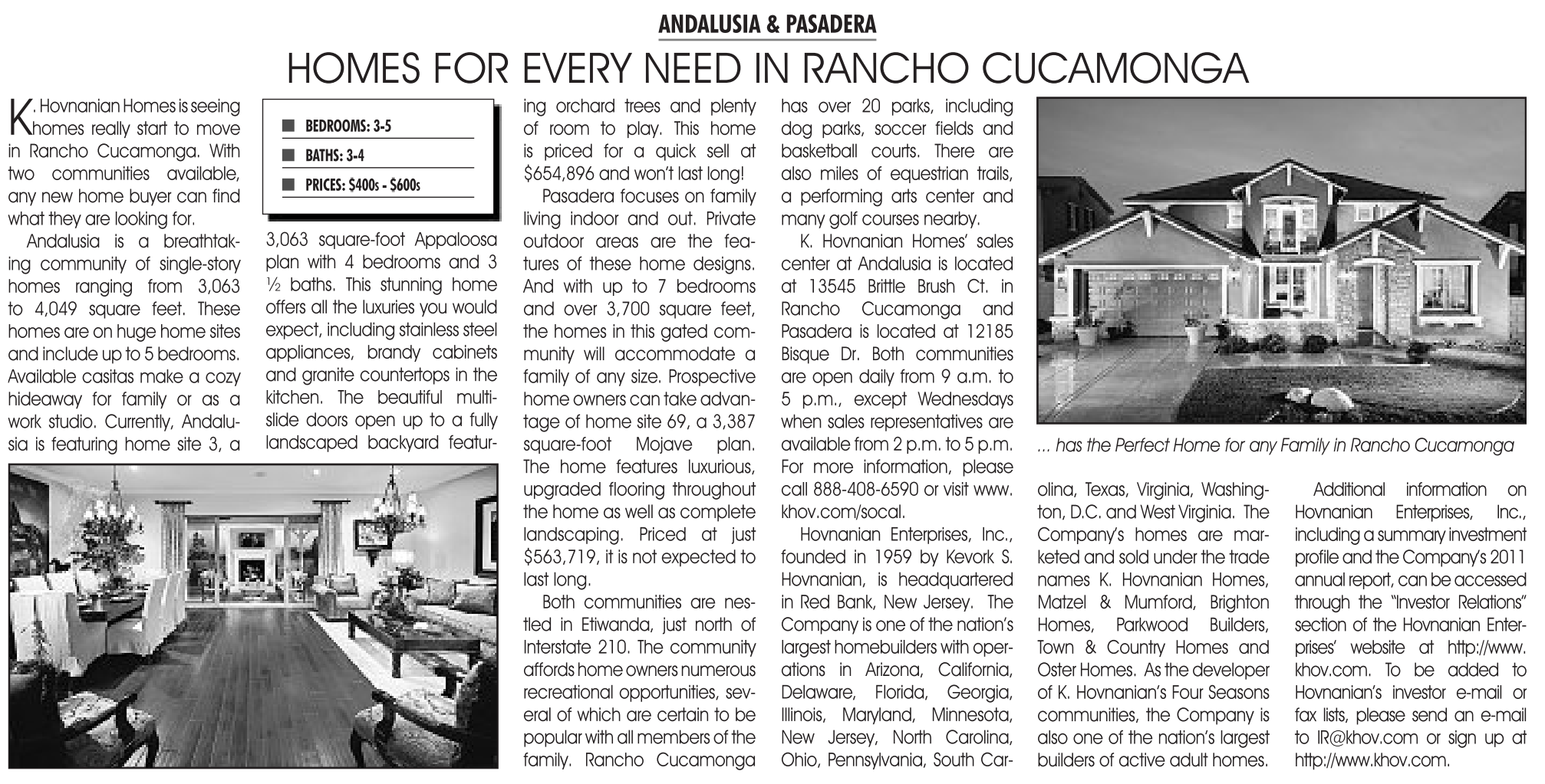 K. Hovnanian Homes’ sales center at Andalusia is located at 13545 Brittle Brush Ct. in Rancho Cucamonga and Pasadera is located at 12185 Bisque dr. Both communities are open daily from 9 a.m. to 5 p.m., except Wednesdays when sales representatives are available from 2p.m. to 5p.m. for more information, please call 888-408-6590 or visit www. khov.com/socal.