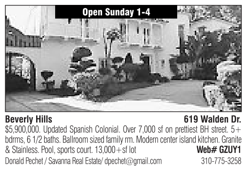 Beverly Hills Open Sunday 1-4 619 Walden Dr. $5,900,000. Updated Spanish Colonial. Over 7,000 sf on prettiest BH street. 5+ bdrms, 61/2 baths. Ballroom sized family rm. Modern center island kitchen. Granite &Stainless. Pool, sports court. 13,000+sf lot Web# GZUY1 Donald Pechet /Savanna Real Estate/ dpechet@gmail.com 310-775-3258 See also