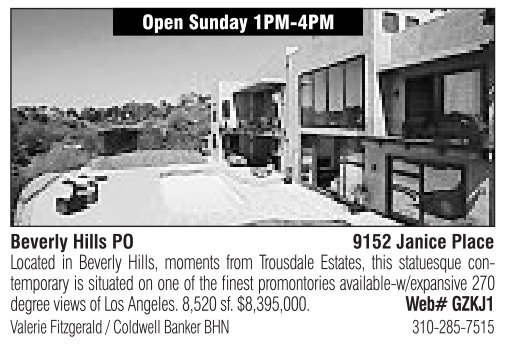 Beverly Hills PO Open Sunday 1PM-4PM 9152 Janice Place Valerie Fitzgerald /Coldwell Banker BHN 310-285-7515 Located in Beverly Hills, moments from Trousdale Estates, this statuesque contemporary is situated on one of the finest promontories available-w/expansive 270 degree views of LosAngeles. 8,520 sf.$8,395,000. Web# GZKJ1 See also