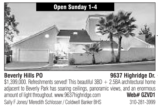 Beverly Hills PO Open Sunday 1-4 9637 Highridge Dr. adjacent to Beverly Park has soaring ceilings, panoramic views, and an enormous $1,399,000. Refreshments served! This beautiful 3BD +2.5BA architectural home amount of light throughout. www.9637highridge.com Web# GZVD1 Sally FJones/ Meredith Schlosser /Coldwell Banker BHS 310-281-3999 See also
