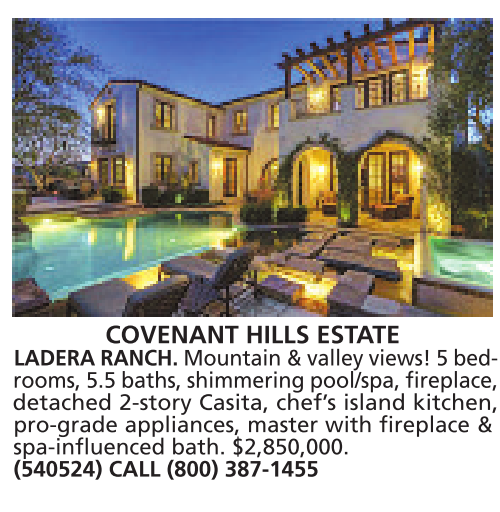 bedrooms, barn, COVENANT HILLS ESTATE LADERA RANCH. Mountain &valley views! 5bedrooms, 5.5baths, shimmering pool/spa, fireplace, detached 2-story Casita, chef’s island kitchen, pro-grade appliances, master with fireplace & spa-influenced bath. $2,850,000. (540524) CALL (800) 387-1455