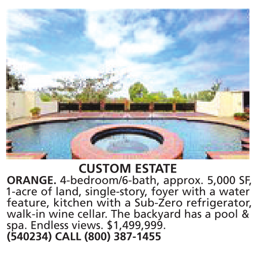 CUSTOM ESTATE ORANGE. 4-bedroom/6-bath, approx. 5,000 SF, 1-acre of land, single-story, foyer with a water feature, kitchen with a Sub-Zero refrigerator, walk-in wine cellar. The backyard has a pool & spa. Endless views. $1,499,999. (540234) CALL (800) 387-1455