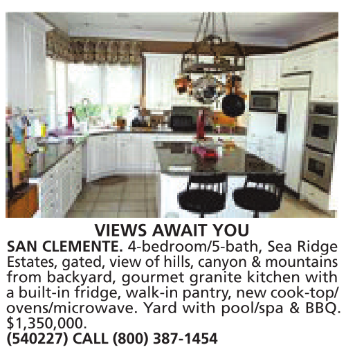 &hills, kitchen, VIEWS AWAIT YOU SAN CLEMENTE. 4-bedroom/5-bath, Sea Ridge Estates, gated, view of hills, canyon &mountains from backyard, gourmet granite kitchen with abuilt-in fridge, walk-in pantry,new cook-top/ ovens/microwave. Yard with pool/spa & BBQ. $1,350,000. (540227) CALL (800) 387-1454