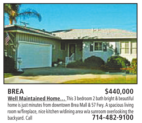 BREA $440,000 Well Maintained Home… This 3bedroom2bathbright&beautiful home is just minutes from downtown Brea Mall &57Fwy.Aspacious living room w/fireplace,nicekitchen w/diningareaw/a sunroomoverlooking the backyard. Call 714-482-9100