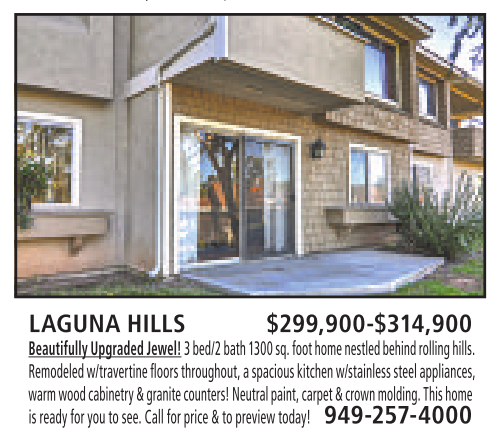 boat access.LARGE driveway &enclosed frontporch. LAGUNA HILLS $299,900-$314,900 BeautifullyUpgradedJewel! 3bed/2 bath 1300 sq. foot home nestledbehindrolling hills. Remodeledw/travertinefloors throughout,aspacious kitchen w/stainlesssteel appliances, warm wood cabinetry&granite counters!Neutral paint,carpet&crown molding.This home is readyfor youtosee.Callfor price &topreview today! 949-257-4000