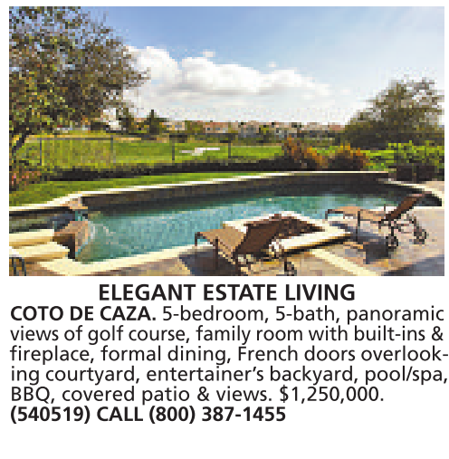 ELEGANT ESTATE LIVING COTO DE CAZA. 5-bedroom, 5-bath, panoramic views of golf course, family room with built-ins & fireplace, formal dining, French doors overlookingcourtyard, entertainer’sbackyard, pool/spa, BBQ, covered patio & views. $1,250,000. (540519) CALL (800) 387-1455