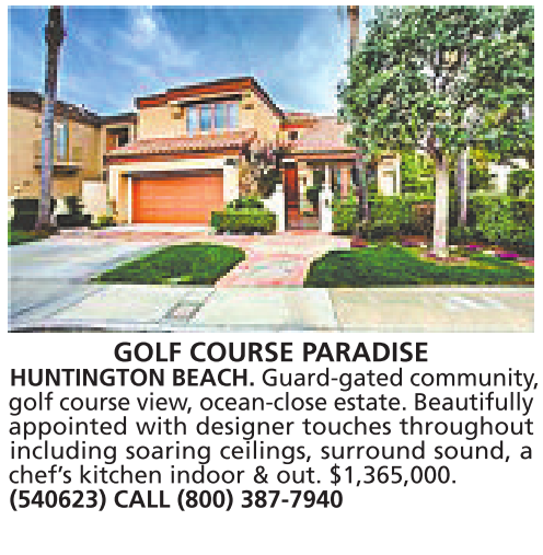GOLF COURSE PARADISE HUNTINGTON BEACH. Guard-gated community, golf course view,ocean-close estate. Beautifully appointed with designer touches throughout including soaring ceilings, surround sound, a chef’s kitchen indoor & out. $1,365,000. (540623) CALL (800) 387-7940